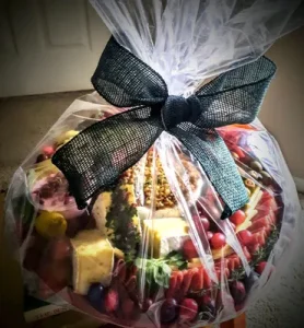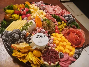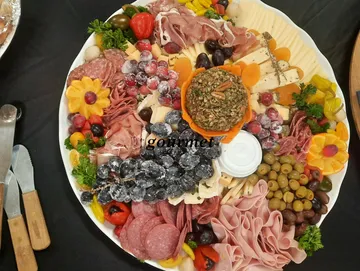 A grandure feast for a King. Country meat terrine and Pate, Froie gras, Honeycomb, House-made balsamic fig jam chutney, House- made Cranberry pistachio biscotti, Artisan Cheese bread crackers, toasted and seasoned with house seasoning spice, Spicy house made pineapple jam chutney, Brie cheese wheel, Imported and domestic array of cheese, Champagne grapes, Fresh made Squaw bread, Cured deli meats, Mortadella, Genoa salami roses, Stuffed dates, olives & antipasto.